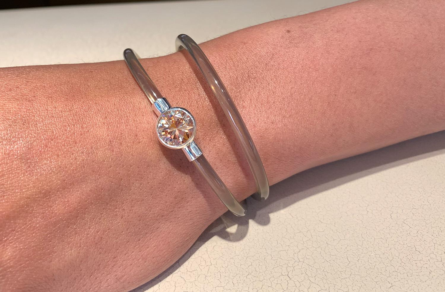 Ein ganzes Jahr lang experimentierte Monika Seitter mit allem, was sich um den Finger wickeln lässt. Dabei entdeckte sie einen Kunststoff, der in vielfarbiger Frische prächtig mit Farbsteinen wie Citrin, Topas oder Amethyst kombiniert werden kann. Die 1970 in Pforzheim geborene Diplomdesignerin ist seitdem ein gefeierter Star der kreativen Schmuckszene.