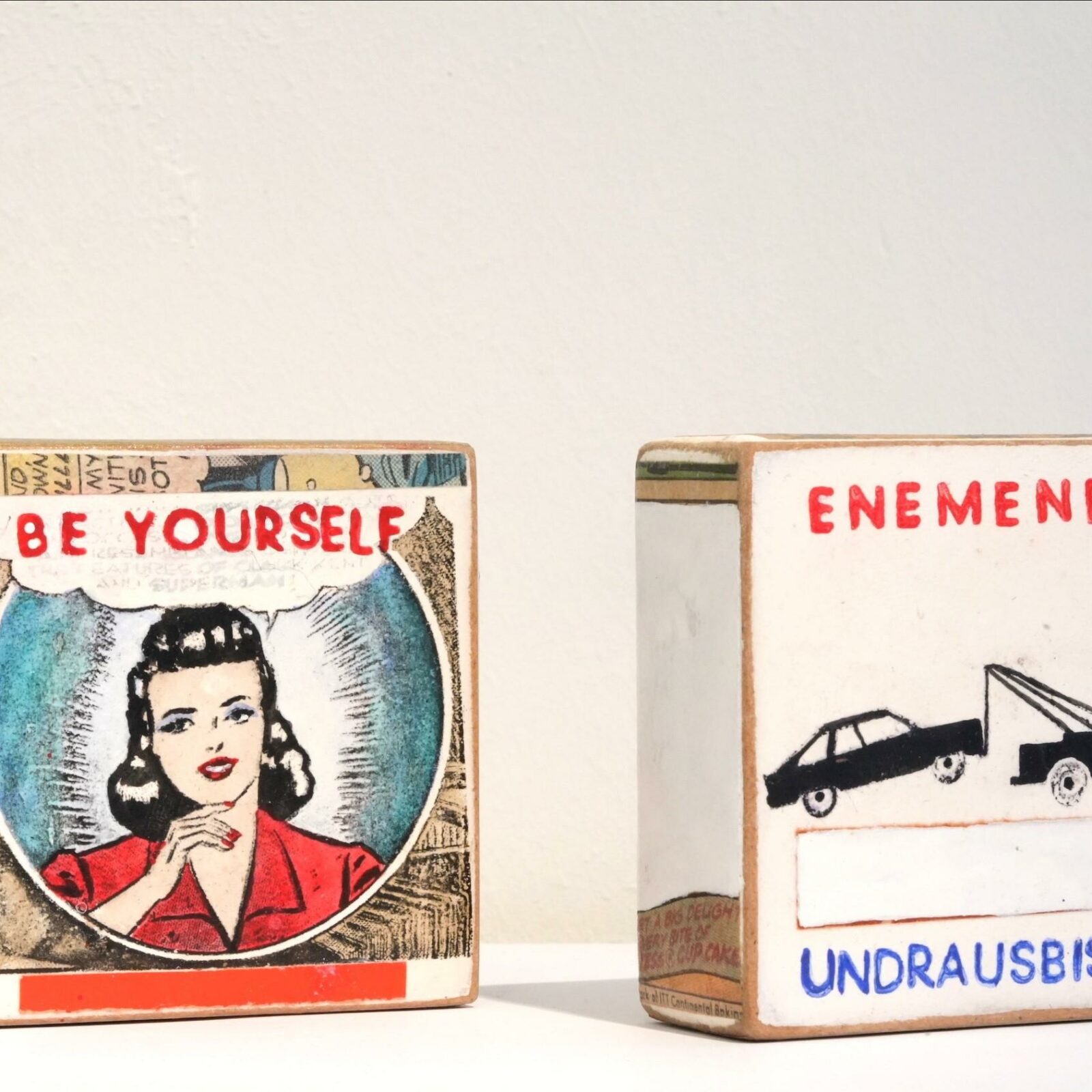 Multiple auf Holzblock mit Magnet, rückseitig handsigniert. Länge ca. 7,5 cm Breite ca. 7,5 cm. Tiefe ca. 3cm. Nitrofrottage: bei dieser Technik werden Vorlagen mit Hilfe eines Lösungsmittels auf Holz übertragen.