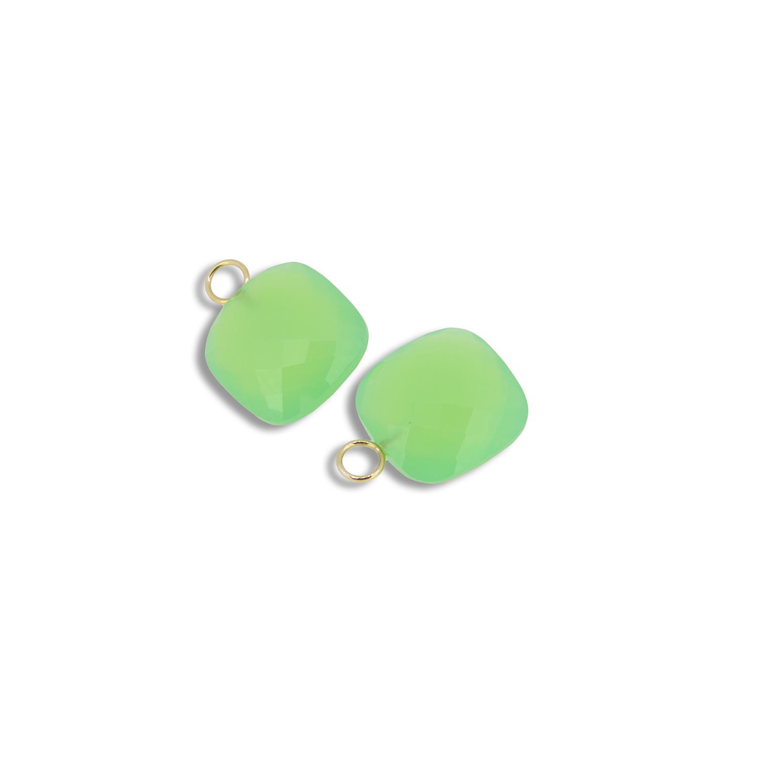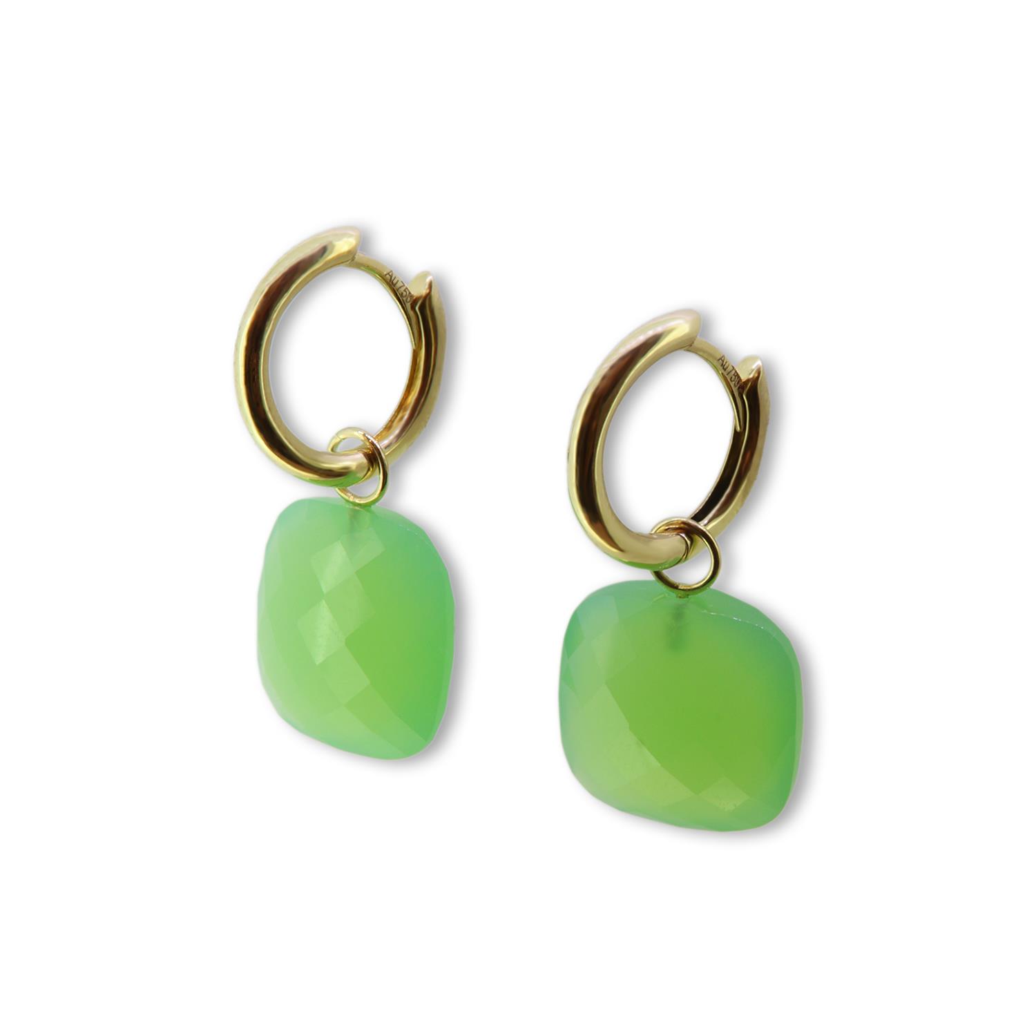 Einhänger für Creolen mit facettiertem Chalcedon gef. grün 13x13mm Briolettschliff, mit 18K Gelbgoldösen.