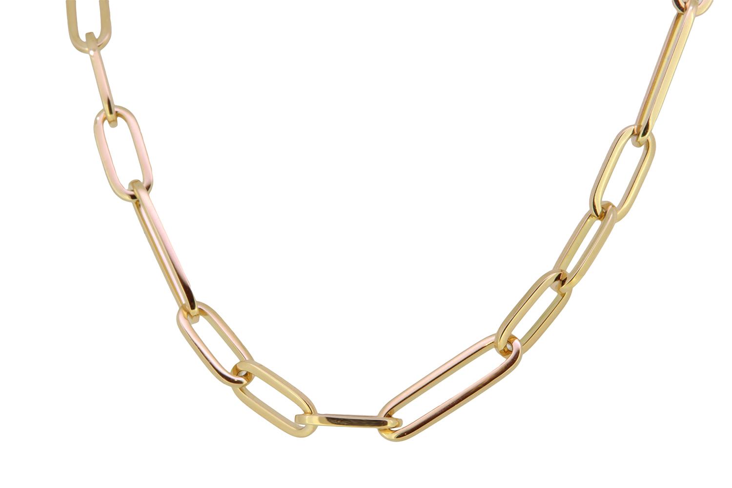 Kette 18K Rotgold poliert, Länge 45cm. Mit abwechselnd drei kleinen Ösen 6x15mm und einer großen Öse 7x23mm.