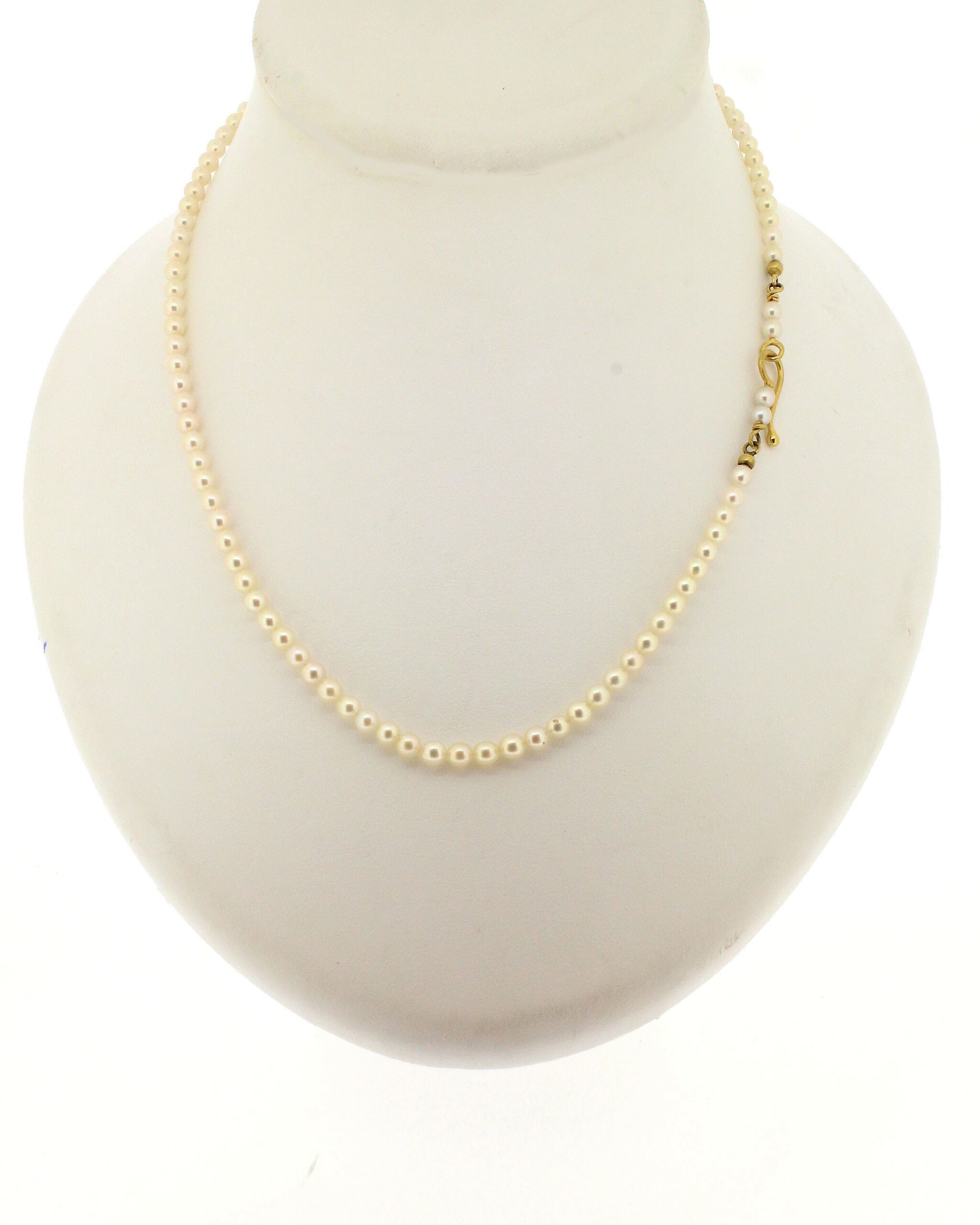 Feines Akoyaperlencollier, 3,5mm kleine runde Akoyaperlen mit handgefertigtem Hakenverschluß aus 18K Gelbgold, Länge 43cm.