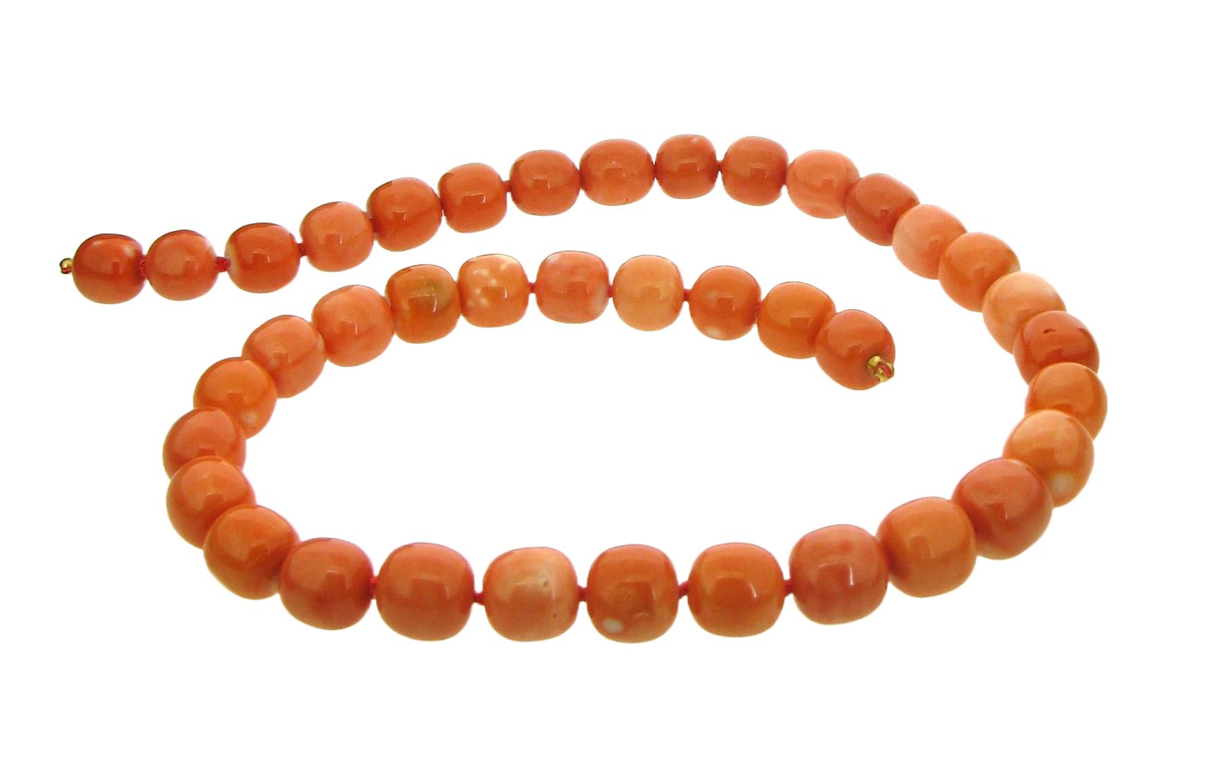 Kette mit Edelkoralle (Corallium Secundum), aus dem Norden von Taiwan, Tonnenform, Patentzapfen aus 18K Gelbgold, Länge 43,5cm, Gewicht 68,69g