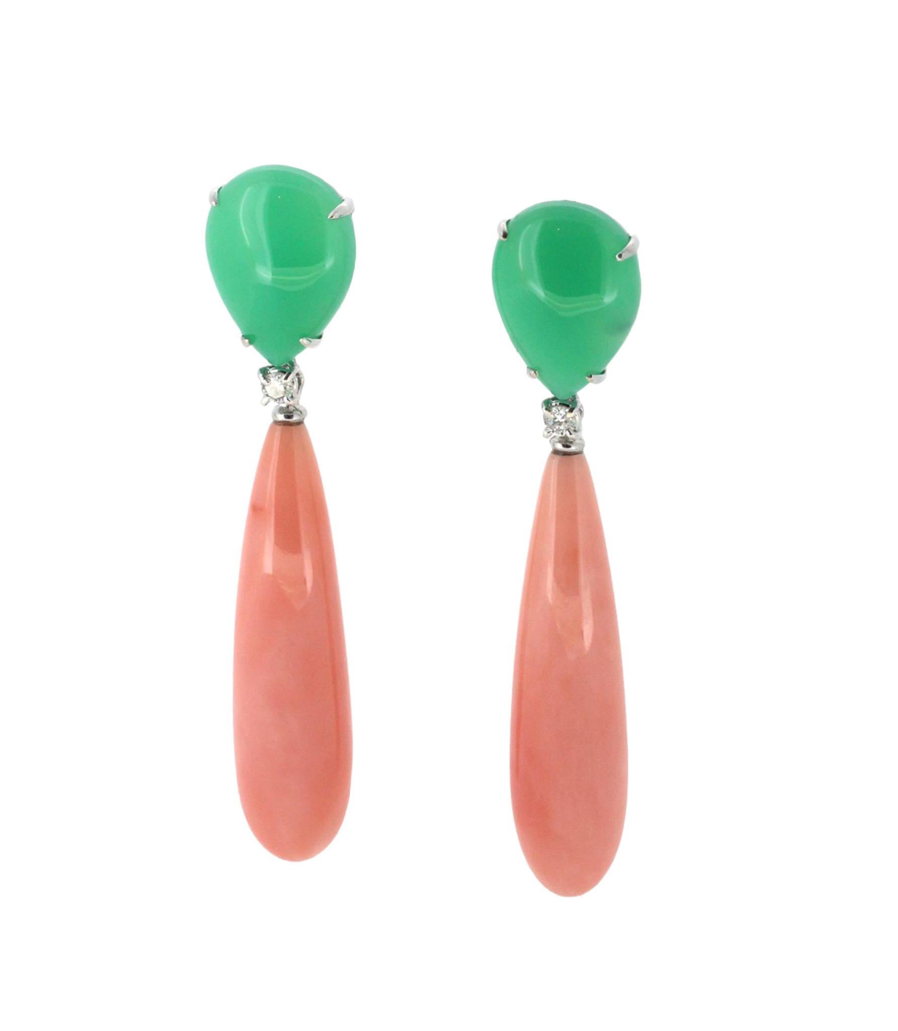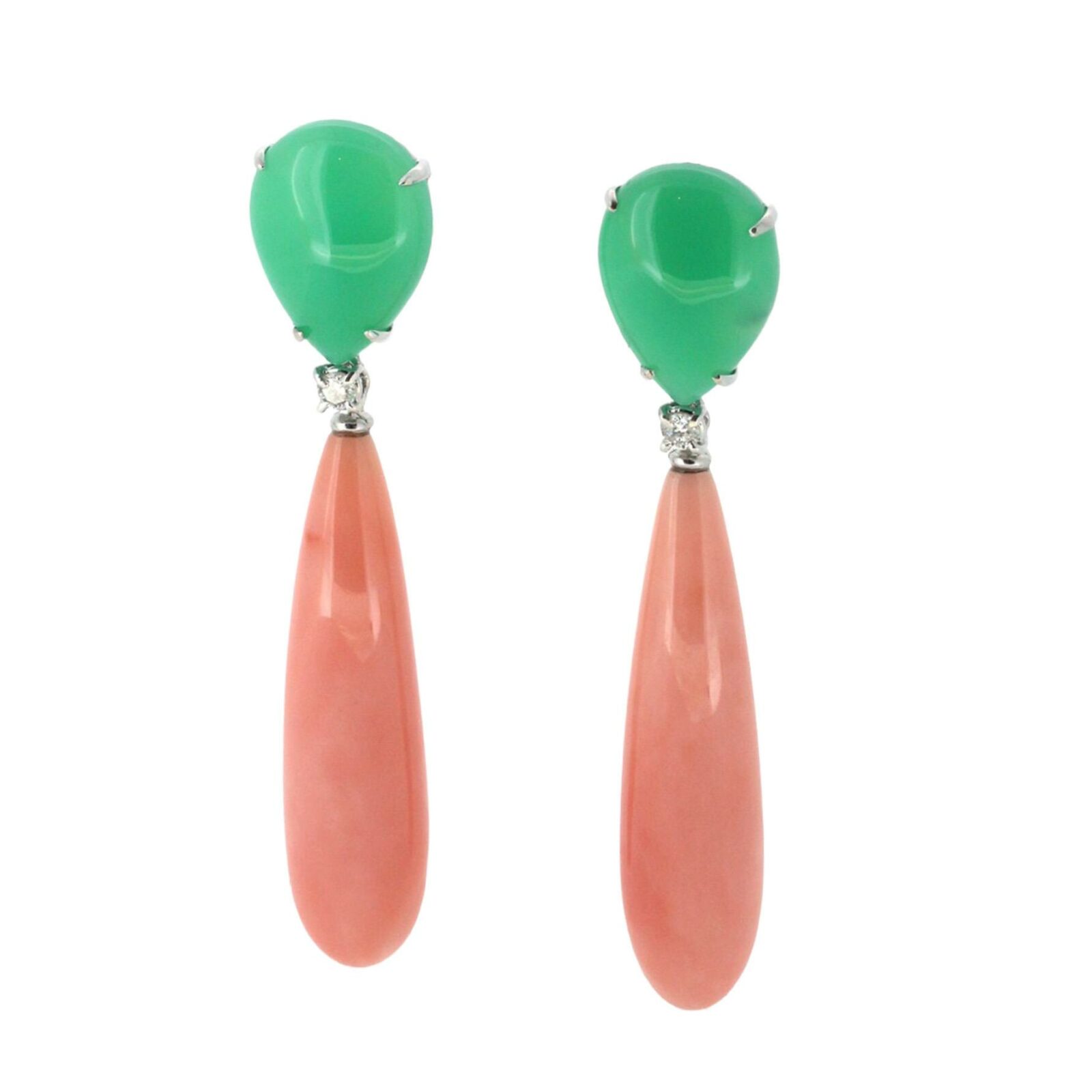 Ohrringe mit Chrysopras, Diamanten, Koralle, 18 Weißgold. Gesamtlänge 60mm.