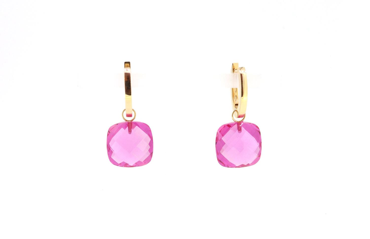 Einhänger für Creolen mit Rubin pink Hydrothermal Synthese im Kissenschliff 13x13mm. Ösen aus 18K Gold.