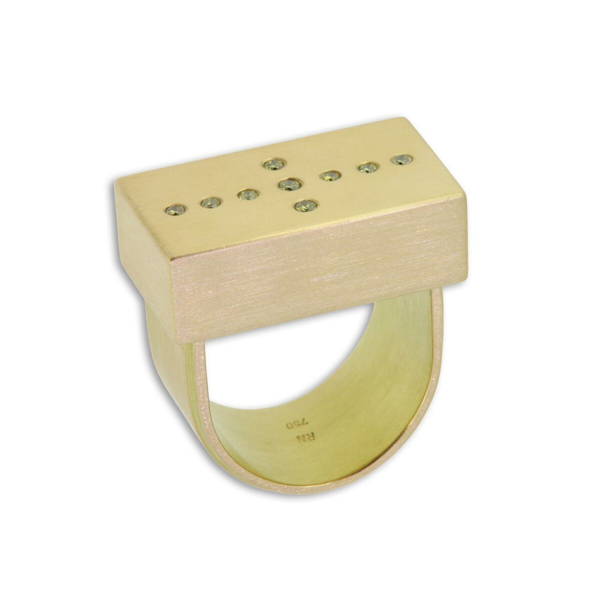 Ring 18K Gelbgold matt mit einem Kreuz aus 9 gelben Brillanten. Der rechteckige Ringkopf ist 14x25x8mm groß, die Ringschiene hat eine Breite von 13mm. Dieser Ring ist ein Unikat und in der Ringgröße 53 verfügbar.