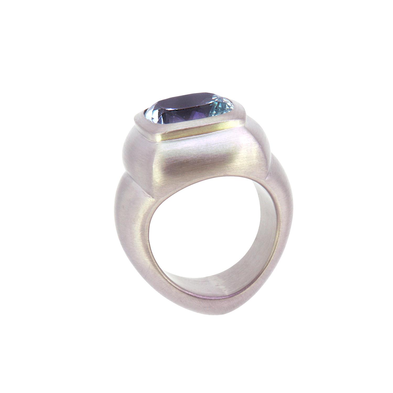 Ring 18K Weißgold fein mattiert mit facettiertem Aquamarin 12x12mm. Ein Unikatring in Größe 54. Design von Corinna Heller.