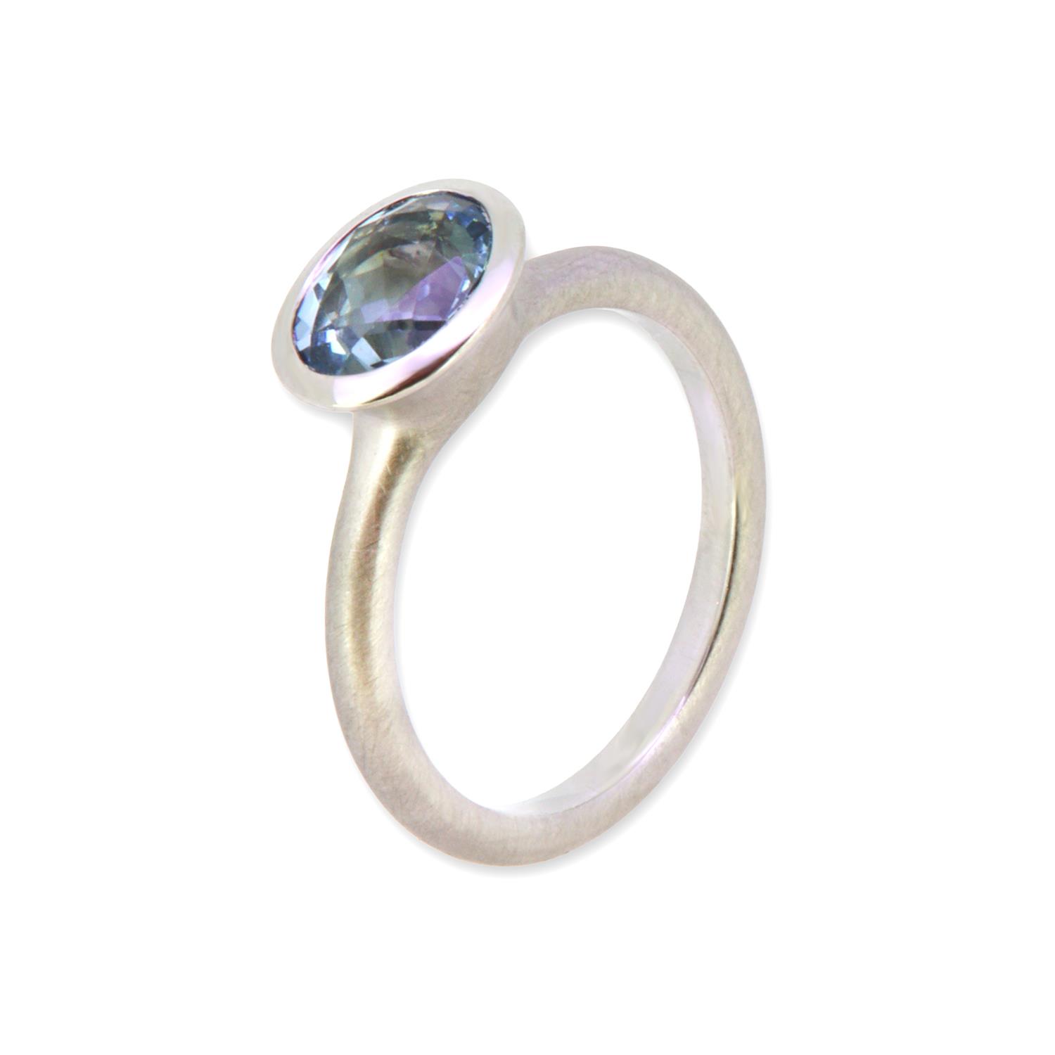 Ring 18K Weißgold mit Aquamarin oval facettiert 1,60ct. Die fein mattierte, runde Ringschiene hat eine Stärke von 2mm. Der Stein in der polierten Fassung haben eine Größe von 8x10mm. Sofort verfügbar in der Ringgröße 55.
