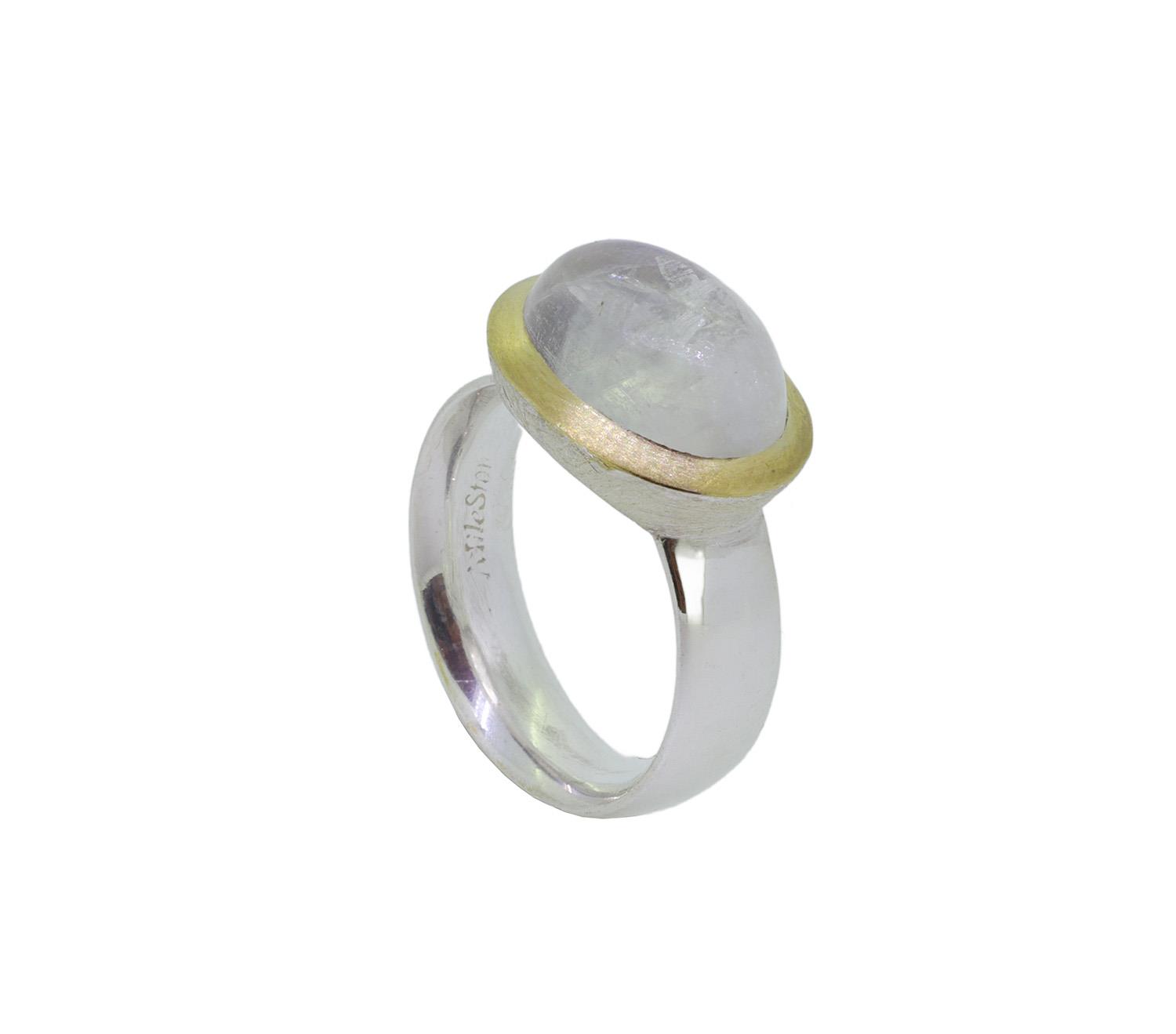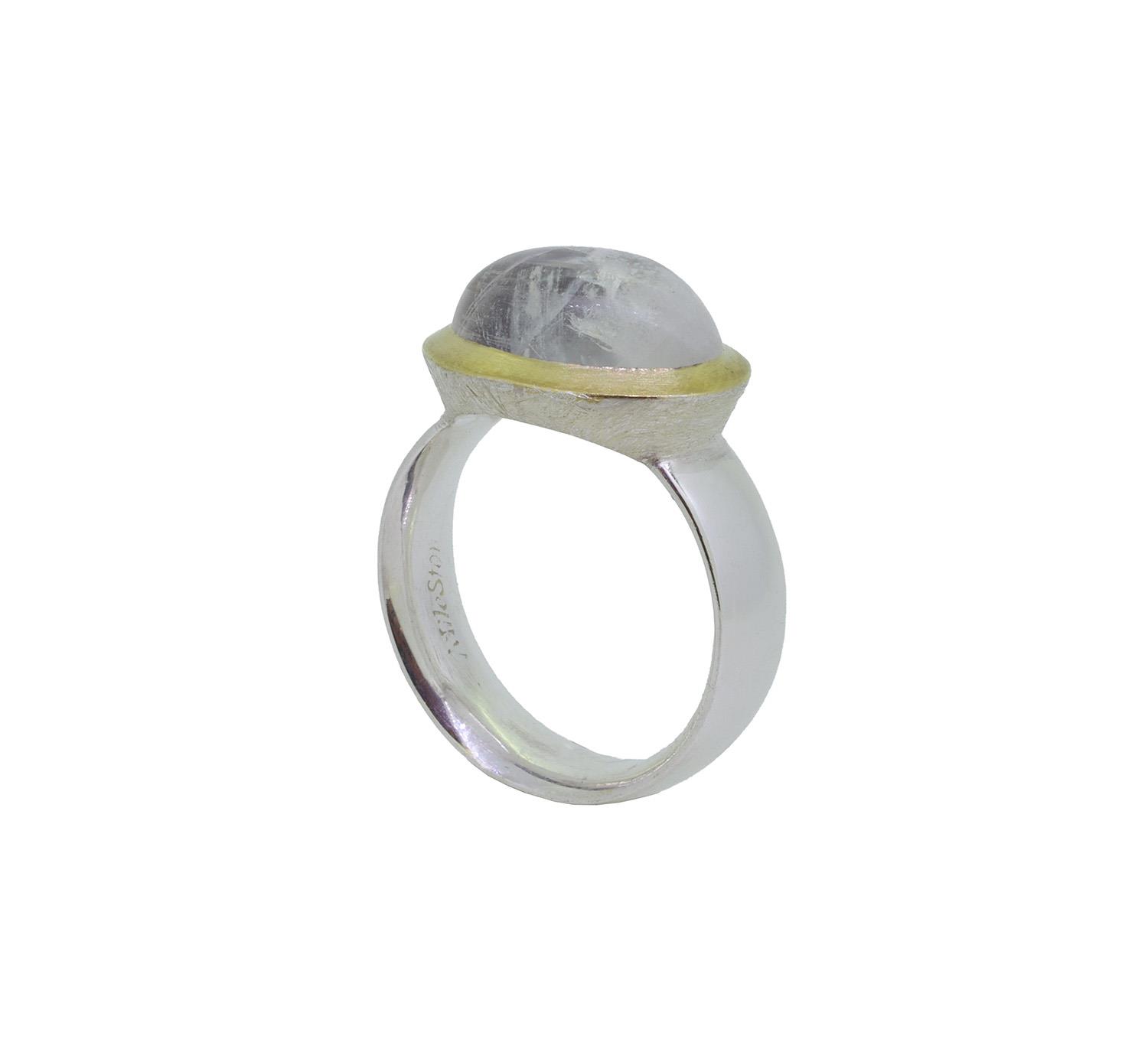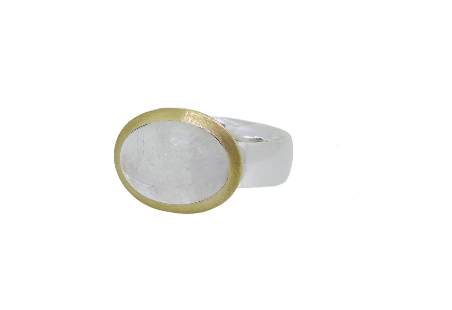 Ring aus 925 Silber mit Labradorit etwa 13 x 10mm groß. Die polierte Ringschiene ist 5,5mm breit. Die Unterseite der Fassung ist eismatt gearbeitet, die Steinumrandung ist mit Gelbgold plattiert und matt.